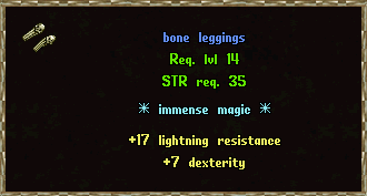 bone legs +7 DEX, +17 lightning resist ![]() bone legs +7 DEX, +17 lightning resist | 1 | 70,000 gp | 70,000 gp | — | @gobi1 | 4d old | Message |