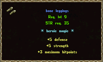 bone legs +5 STR, +3 HP, +5 defense ![]() bone legs +5 STR, +3 HP, +5 defense | 1 | 25,000 gp | 25,000 gp | — | @gobi1 | 4d old | Message |