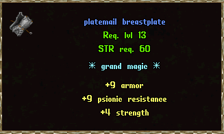 platemail breastplate +4 STR, +9 armor, +9 psionic resist ![]() platemail breastplate +4 STR, +9 armor, +9 psionic resist | 1 | 25,000 gp | 25,000 gp | — | @gobi1 | 4d old | Message |