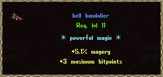bell bandolier +5,1% magery, +3 HP ![]() bell bandolier +5,1% magery, +3 HP | 1 | 25,000 gp | 25,000 gp | — | @gobi1 | 4d old | Message |
