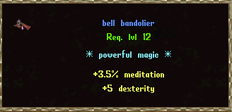 bell bandolier +5 DEX, +3,5% meditation ![]() bell bandolier +5 DEX, +3,5% meditation | 1 | 30,000 gp | 30,000 gp | — | @gobi1 | 4d old | Message |